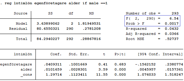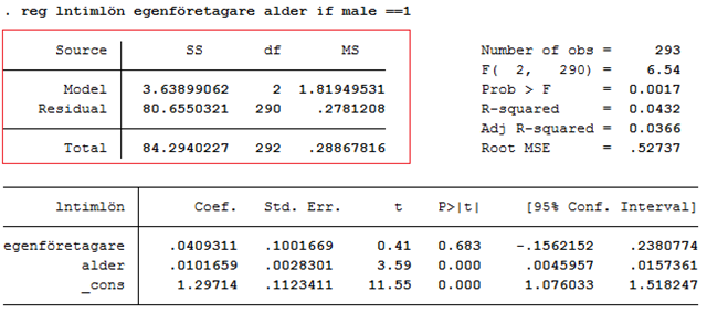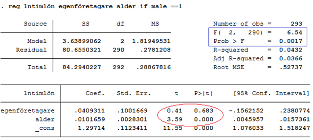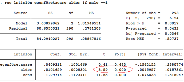 Regressionen nedan visar att egenföretagarna tjänar cirka 4 procent mer än anställda, kontrollerat för ålder. Men skillnaden är inte signifikant, t = 0,041/0,100 = 0,41 (standardfel ges inom parentes). Däremot har åldern en signifikant effekt på lönen; för varje ytterligare år så ökar lönen med cirka 1 procent, t = 0,010/0,003 \(>\) 3.