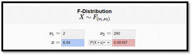 I vårt exempel har vi alltså 2 frihetsgrader i täljaren och 290 i nämnaren. Med hjälp av en kalkylator kan vi då få fram p-värdet: