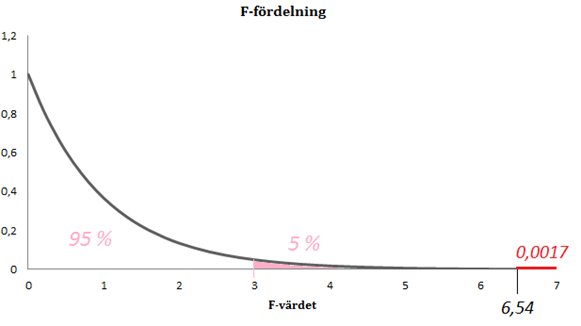 Det här är ett exempel på en F-fördelning. Om nollhypotesen är sann (den sanna förklaringsgraden är noll) så får vi ett sampel där F-värdet hamnar någonstans mellan 0 och 3 i 95 procent av fallen. (Ett F-värde någonstans mellan 0 och 3 motsvarar här en förklaringsgrad någonstans mellan 0 och 0,02.) Om vårt F-värde faller inom detta intervall så är resultatet insignifikant; den uppmätta förklaringsgraden i samplet skulle då kunna skyllas på slumpen. I 5 procent av fallen får vi dock ett F-värde som är större än 3. Om vi får ett sampel där F-värdet blir 3,0 så betyder det att samplet hör till de 5 procent mest extrema som man kan få bara av slumpen och p-värdet är då 0,05; vi har då ett bra stöd för att påstå att den sanna förklaringsgraden är större än 0. Men vi fick ett F-värde på 6,54 vilket ger ett p-värde på 0,0017. Regressionsmodellen har med andra ord signifikant förklaringsstyrka också på 1-procentsnivån: p-värdet = 0,0017 < 0,01.