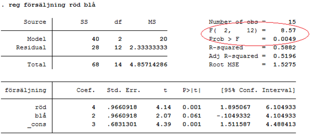 F-testet används alltså för att ta reda på om regressionsmodellen har signifikant förklaringsstyrka. Men varifrån kommer då F-värdet på 6,54?