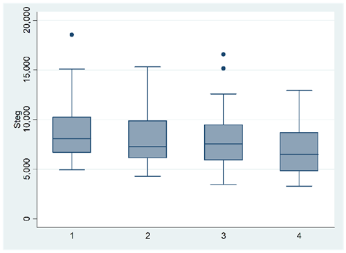 - [Kräver online-kalkylator] I en studie ger man 160 personer varsin stegräknare. Man delar sedan in individerna i fyra grupper omfattande 40 personer vardera. Målet är att testa olika “incitamentssystem” för att motivera personerna att röra på sig mer. Exempel: I en grupp får den som gått mest under loppet av en månad en summa pengar. I en annan grupp får alla som gått minst 10 000 steg per dag ett diplom, osv. Figuren nedan visar hur många steg personerna tog per dag beroende på incitamentssystem. Förklaringsgraden är 0,064.