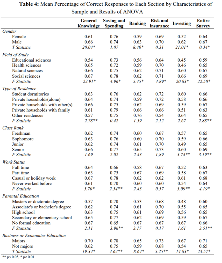 - Tabellen nedan är hämtad ur artikeln A Survey on Financial Literacy Among University Students. Här har man låtit ett sampel studerande ta ett test som mäter hur bra koll de har på finansfrågor. Se kolumnen General Knowledge. Författaren har här gjort flera F-tester. Beskriv i ord vad författaren egentligen testat här och sammanfatta resultatet. Notera också att författaren ibland använt t-testet och ibland F-testet. Varför tror du det är fallet?