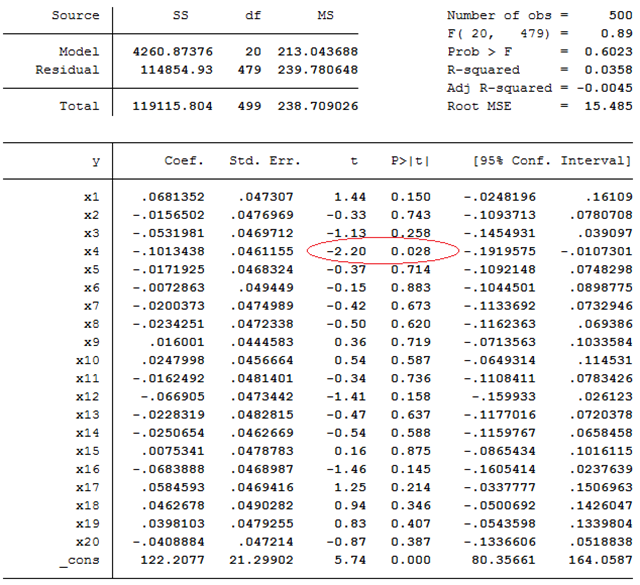 Om åldern har en signifikant effekt på lönen så måste väl också F-testet per konstruktion visa att regressionsmodellen har signifikant förklaringsstyrka? Svaret är nej. Anta att nollhypotesen är sann; ingen x-variabel har någon effekt på utfallsvariabeln. Ju fler x-variabler vi inkluderar i regressionen, desto högre är sannolikheten för att åtminstone en effekt ändå blir signifikant. Nedan visas ett exempel på detta. Här har vi en regression med 20 oberoende variabler (x1, x2, …, x20). Ingen av dessa har egentligen någon effekt på utfallsvariabeln; de effekter vi ser i data beror enbart på slumpen. I de flesta fall har vi därför fått estimat som ligger nära 0 och som är icke-signifikanta. Men det finns ett misstag; t-testet visar att effekten av x4 är signifikant.