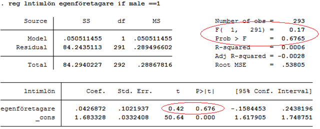 Exempel forts. Nedan visas resultat från en regression med loggad timlön som utfallsvariabel och dummyn egenföretagare som oberoende variabel. Här har vi alltså inte kontrollerat för ålder. Egenföretagarna tjänar i snitt drygt 4 procent mer än anställda, men skillnaden är inte signifikant (t = 0,42, p-värdet = \(\color{red}{0,676}\)). Regressionsmodellen har inte heller signifikant förklaringsstyrka (F = 0,17, p-värdet = \(\color{red}{0,6765}\)). Notera här att p-värdena är lika stora. Detta beror på att bägge testar exakt samma sak. När vi bara har en oberoende variabel så kommer vi från t-värdet till F-värdet genom att kvadrera t-värdet: 0,422 \(\approx\) 0,17.