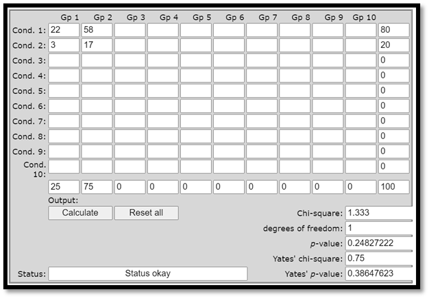 Chi2-värdet är 1,333 och p-värdet är 0,248. Sambandet är alltså inte signifikant. Följande online-kalkylator ger oss samma resultat: