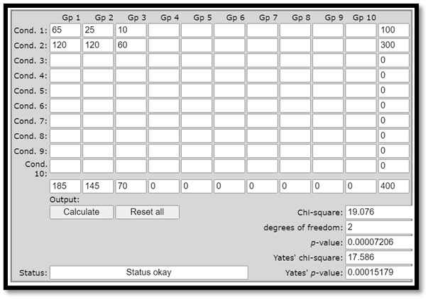 Notera här att chi2-testet också anger vår status (“Status okay”). Chi2-testet bygger nämligen på följande två antaganden: