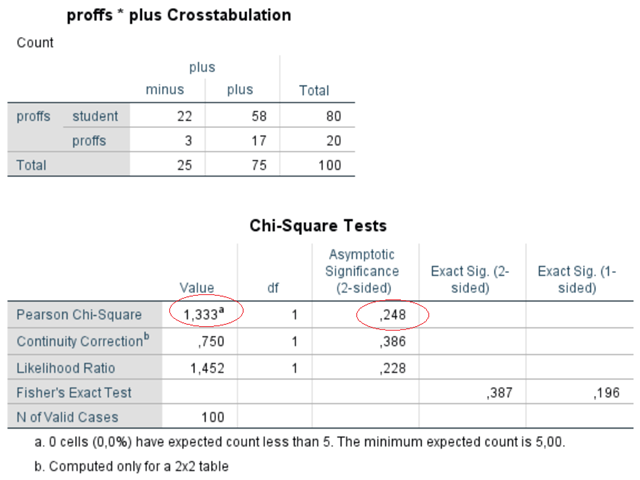 Exempel. Är professionella placerare bättre på att sätta ihop en aktieportfölj än studenter? Vi har gjort ett experiment där 80 studenter och 20 professionella placerare fått sätta ihop aktieportföljer (var och en har satt ihop en egen portfölj). En månad senare mäter vi om aktieportföljerna ligger på plus eller minus. Bland studenterna ligger 22 portföljer på minus och 58 på plus. Bland proffsen ligger 3 portföljer på minus och 17 på plus: