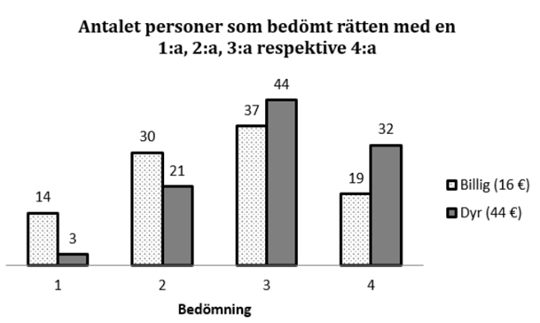 - [Kräver online-kalkylator] Hur mycket av vår smakupplevelse är psykologi? Vi låter 200 personer genomgå följande test. De bjuds på en middag på en fin restaurang och ska sedan bedöma hur bra rätten smakade på en skala mellan 1 och 4 (högre vitsord = bättre). 100 personer lottas ut och dessa får veta att rätten vanligtvis kostar 44 euro. De övriga 100 får veta att rätten vanligtvis kostar 16 euro. (Alla äter dock exakt samma rätt.) Stapeldiagrammet nedan beskriver hur de två grupperna bedömt rätten. Finns det signifikanta skillnader i bedömning beroende på om man fått höra att rätten är dyr eller billig?