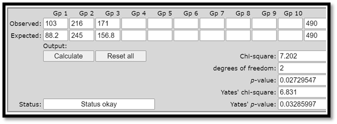 \[= \frac{{(103 - 88,2)}^{2}}{88,2} + \frac{{(216 - 245)}^{2}}{245} + \frac{{(171 - 156,8)}^{2}}{156,8} \approx 7,202\]