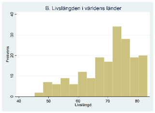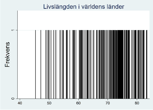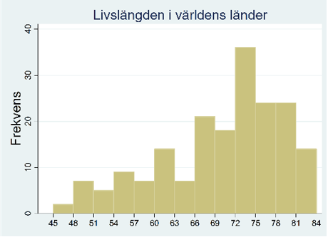 I figuren nedan har vi valt att dela in länderna i tretton grupper så att den första gruppen är länder med en livslängd på 45 till 48 år; den andra gruppen är länder med en livslängd på 48 till 51 år; …; den sista gruppen är länder med en livslängd på 81 till 84 år.