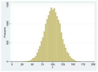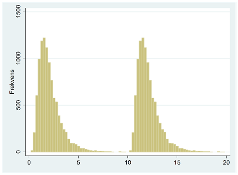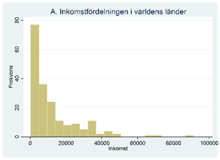 Totalt täcker samplet cirka 200 länder och om vi ritar upp datamaterialet i ett frekvensdiagram så får vi följande figur: