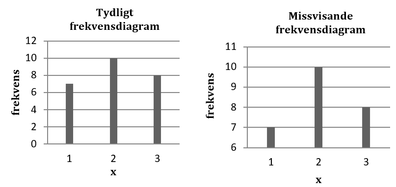 Finns det något man ska tänka på när man gör upp ett frekvensdiagram? Jo, här är en sak. x-axeln kan börja där det passar data bäst (här tänker vi oss att x-axeln visar variabelns värden). I frekvenstabellen uppe till höger så börjar x-axeln vid 1,5. Men y-axeln bör börja vid 0. Annars får man en förvrängd bild av datamaterialet, vilket figurerna nedan visar. I figuren till höger börjar y-axeln vid 6. Detta ger intrycket av att talet 2 är starkt överrepresenterat, fastän detta egentligen inte är fallet.