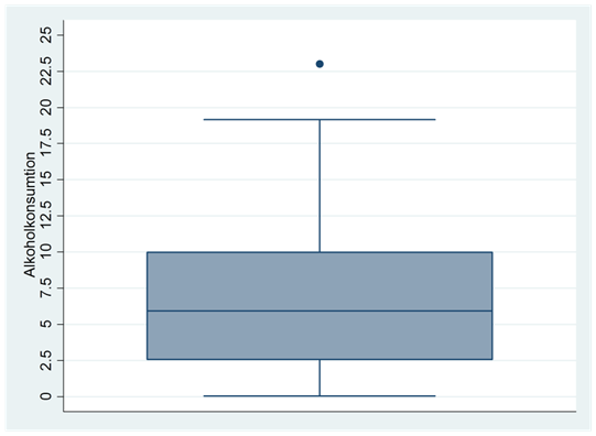 - Låddiagrammet nedan visar fördelningen för alkoholkonsumtionen i världens länder. Alkoholkonsumtionen mäts som liter per vuxen invånare.