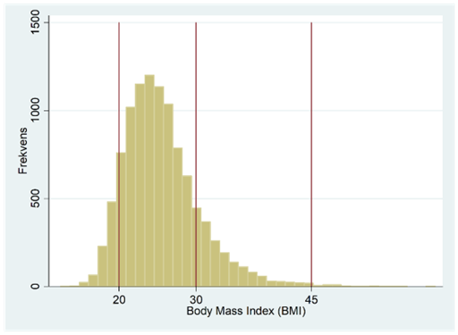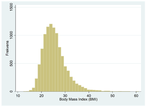 Nedan ser du ett annat exempel på en fördelning som är skev åt höger. Detta histogram bygger på data för ca 10 000 amerikaner och visar deras BMI (body mass index: <18,5: underviktig; 18,5-24,9: normalviktig; >25: överviktig).