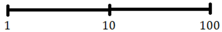 Figuren nedan visar hur vi kan visualisera den logaritmiska skalan. På en logaritmisk skala är avståndet mellan 1 och 10 lika stort som det mellan 10 och 100: log(100)-log(10) = log(10)-log(1). På motsvarande sätt är avståndet mellan 1 och 2 lika stort som det mellan 2 och 4 och avståndet mellan 1 och 5 är lika stort som det mellan 5 och 25.