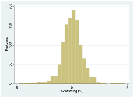 - I fråga 17 tittade vi på aktiekursen för Walmart. Vi använde då tio handelsdagar. Histogrammet nedan visar fördelningen för den dagliga avkastningen under de senaste 1167 handelsdagarna. I snitt ligger avkastningen på 0,018 procent med en standardavvikelse på 0,960 procentenheter. Den sista dagen var stängningspriset 63,95 dollar. Utifrån detta kan vi prognostisera att Walmart-aktien kommer att kosta 63,96 dollar dagen därpå (dvs. en ökning med 0,018 procent). Den här prognosen är förstås osäker. Gör nu upp ett prognosintervall för detta pris, dvs. ett intervall som ringar in var priset kommer landa med 95-procentig sannolikhet.