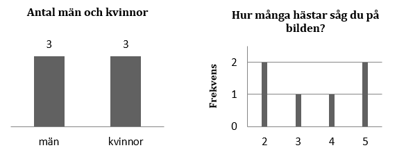 Den här frekvenstabellen visar att 2 personer såg två hästar; 1 person såg tre hästar; 1 person såg fyra hästar och 2 personer såg fem hästar.