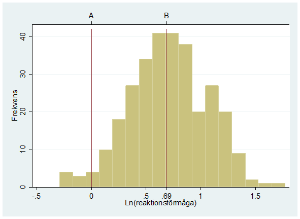 - 300 pensionärer får genomgå ett test där man mäter deras reaktionsförmåga i trafiken. Histogrammet nedan visar fördelningen för pensionärernas loggade reaktionstider (den naturliga logaritmen). Agnes (A) fick en reaktionstid som var hälften av Bosses (B).
