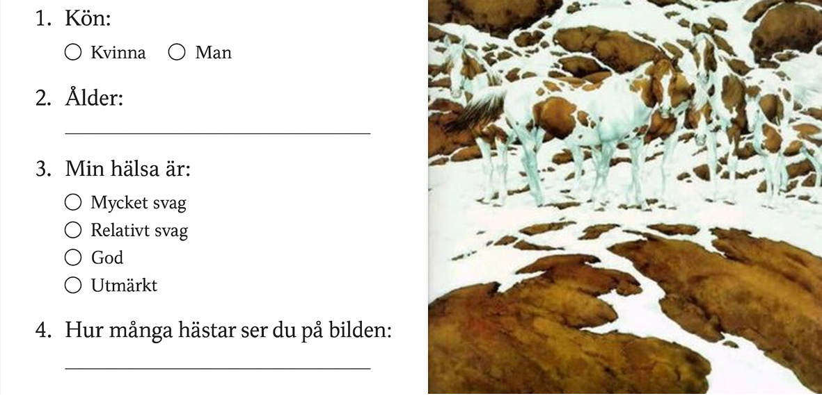 Som du ser så kan vi beskriva variabler med ord eller siffror. Variabler som naturligt mäts på en numerisk skala kallas för kvantitativa variabler. Ålder och Hästar är kvantitativa variabler. Andra exempel på kvantitativa variabler är längd, vikt, priser, löner, temperatur, antalet poäng på ett prov eller inflationstakten.