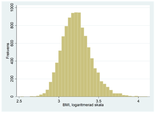 Om vi logaritmerar BMI-värdena så får vi histogrammet nedan, dvs. en normalfördelning. Vi säger då att BMI följer en lognormalfördelning. En lognormalfördelning karaktäriseras alltså av att den är skev åt höger och blir en normalfördelning efter logaritmering. Gemensamt för alla lognormalfördelningar är att variabeln (i detta exempel BMI) bara antar positiva värden.