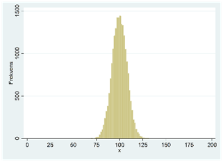 Uppe till vänster har vi en normalfördelning. Vi känner igen en normalfördelning på dess symmetriska och klockformade mönster. Normalfördelningen är den viktigaste fördelningen inom statistiken. En orsak är att många variabler följer en normalfördelning, åtminstone ungefärligt. Här är några exempel: Längden för en kvinna, barnets födelsevikt, blodtrycket hos en ung person och vilopulsen hos en frisk vuxen. Många tester konstrueras så att testpoängen ska följa en normalfördelning, exempelvis intelligenstester.