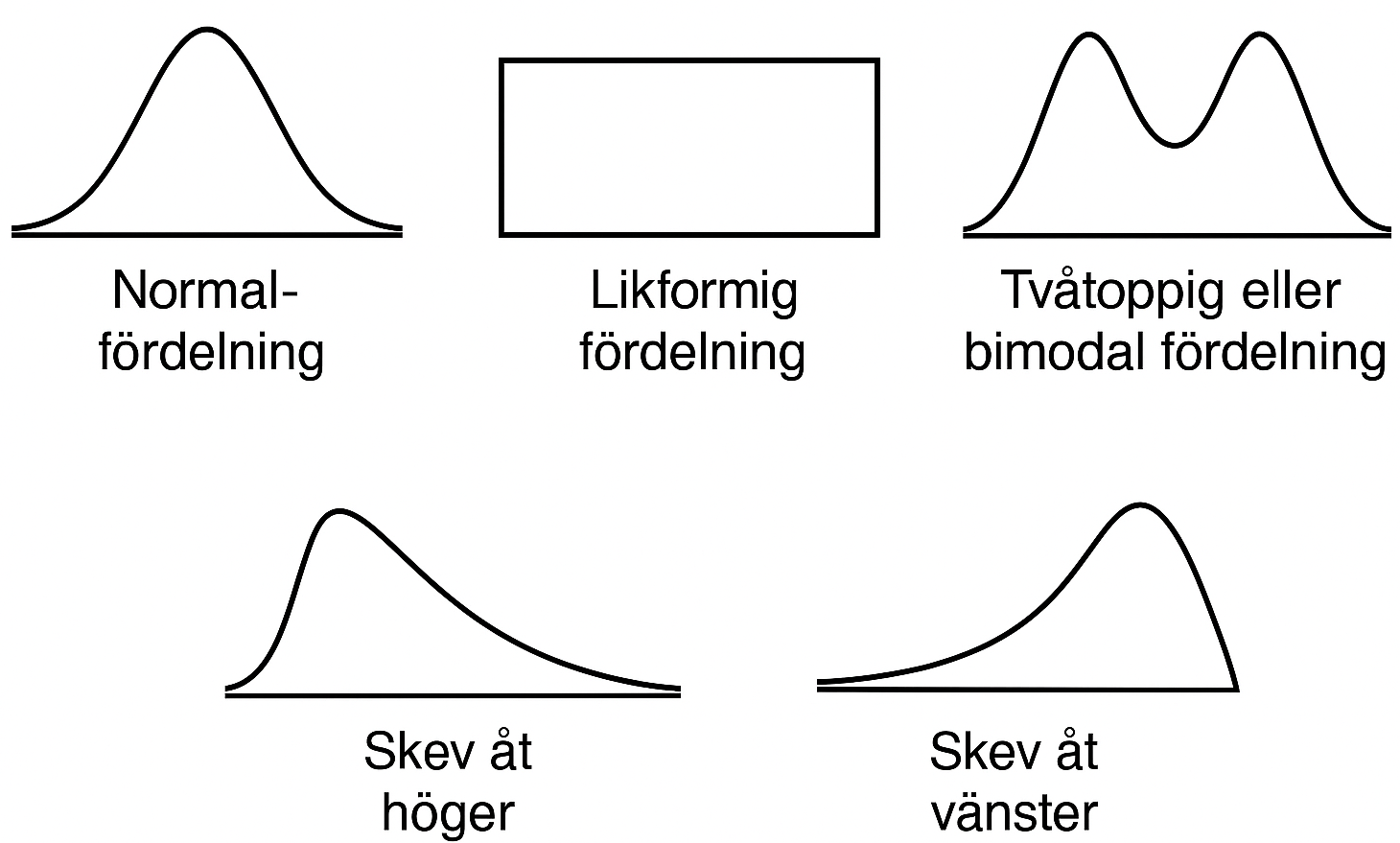 Vissa typer av histogram dyker upp i så pass många olika sammanhang att det blir praktiskt att ge dem namn. Nedan ser du fem sådana fördelningar.