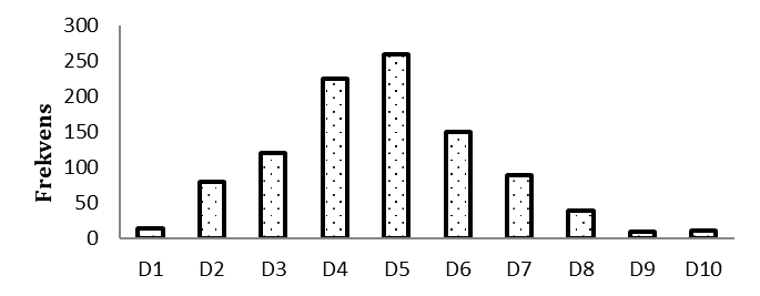 - Vi har samplat 1000 personer och mätt deras inkomster i euro per månad. Vi har delat in personerna i tio decilgrupper, betecknade D1, D2, …, D10. Frekvensdiagrammet nedan visar hur många personer som ingår i respektive decilgrupp. Eller? Förklara vad som inte stämmer med detta frekvensdiagram.