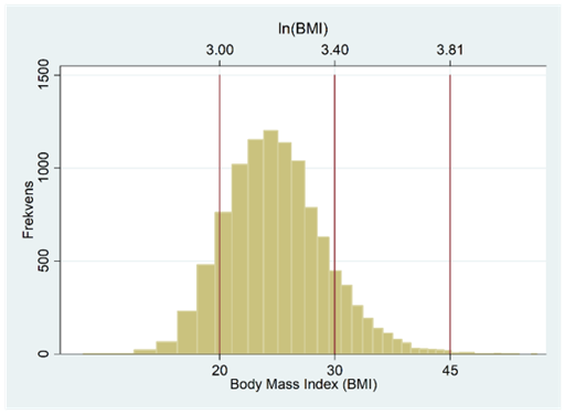 Vi kan nu se hur en fördelning med en längre svans till höger kan bli symmetrisk genom logaritmering. Nedan visas BMI-fördelningen. Procentuellt sett så gäller att avståndet mellan 20 och 30 är lika långt som avståndet mellan 30 och 45; båda gångerna ökar vi med 50 procent.