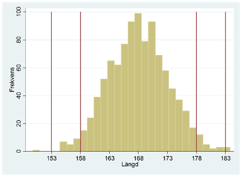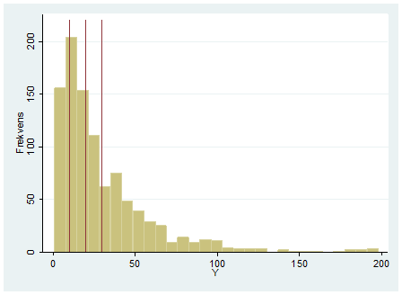 - Se histogrammet nedan. De tre utritade sträcken i rött representerar medelvärdet, medianen och typvärdet (men inte nödvändigtvis i den ordningen). Skriv in rätt lägesmått vid respektive sträck. Ange också om den här fördelningen är skev åt vänster, skev åt höger eller symmetrisk.