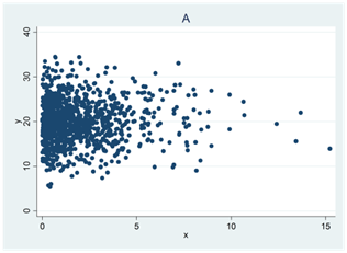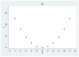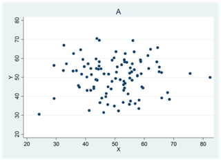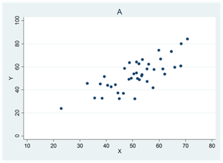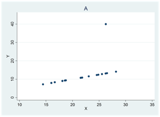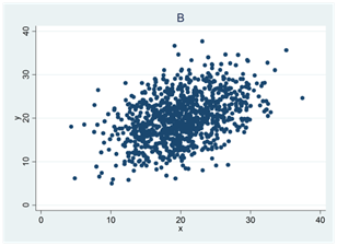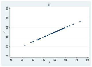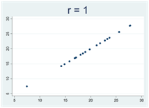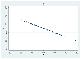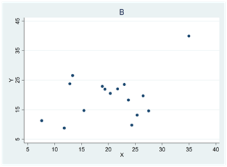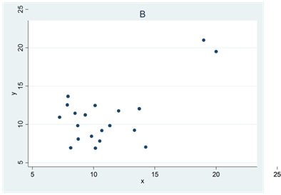 Diagram B visar ett datamaterial där korrelationen hade varit 0 om det inte vore för den ena avvikande observationen. Denna har stort inflytande på Pearsons korrelationskoefficient som här får värdet 0,41; Spearmans rangkorrelation påverkas inte lika mycket utan har värdet 0,06.