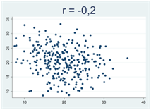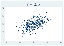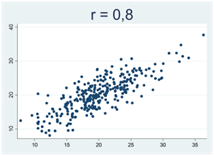Generellt gäller att då korrelationskoefficienten närmar sig 1 eller -1 så samlas observationerna allt tajtare kring en rät linje. Figurerna nedan illustrerar detta, där r betecknar Pearsons korrelationskoefficient:
