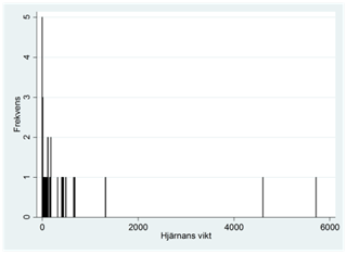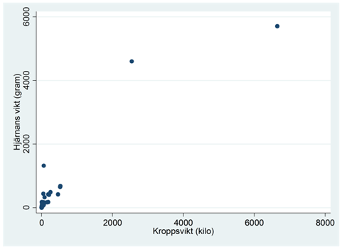 Exempel. Spridningsdiagrammet nedan visar sambandet mellan kroppsvikt och hjärnans vikt för 62 olika djurarter. Kroppsvikten mäts i kilo och hjärnans vikt i gram.