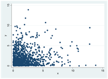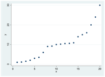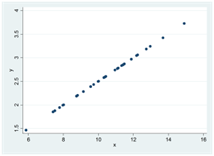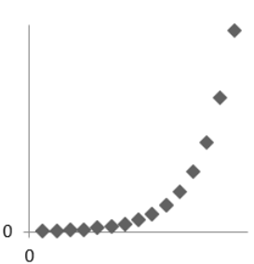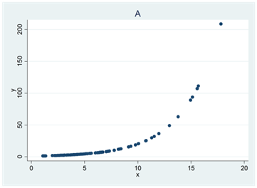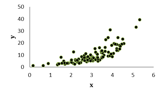 Exempel. Se spridningsdiagrammet nedan. För vilken axel skulle en loggad skala vara lämplig?