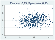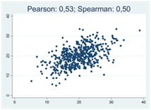 För typiska spridningsdiagram så antar Pearsons och Spearmans korrelationskoefficienter mer eller mindre samma värde:
