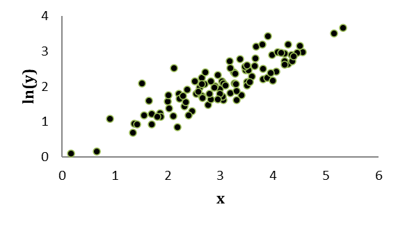Om ditt svar är “y-axeln” så har du tänkt rätt. När vi logaritmerar y så får vi följande spridningsdiagram: