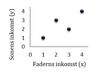 Exempel. Finns det ett samband mellan faderns och sonens inkomst? För enkelhetens skull tänker vi oss här att vi bara har fyra observationer, dvs. fyra par av fäder och söner. I tabellen nedan representerar x faderns inkomst och y sonens. Inkomsterna mäts i tusentals euro (så att värdet 1 representerar en inkomst på tusen euro). I snitt tjänar både fäder och söner 2500 euro: \(\overline{x} = \overline{y} = 2,5\). Hur stor blir kovariansen mellan faderns och sonens inkomst?