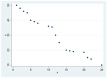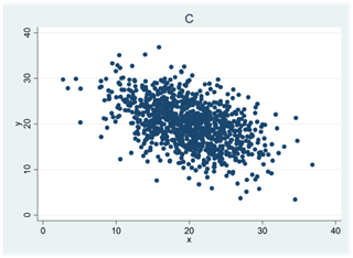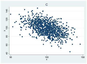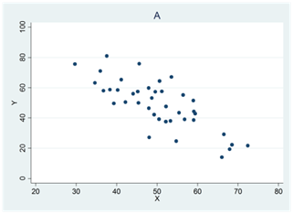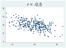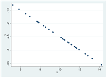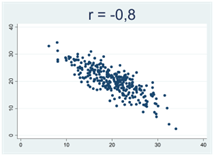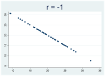 Se figur A nedan: Då x ökar så minskar y i genomsnitt. Vi har då en negativ korrelation mellan variablerna. En korrelation på -1 betyder att alla observationer kan ritas längs med en nedåtlutande linje (figur B).