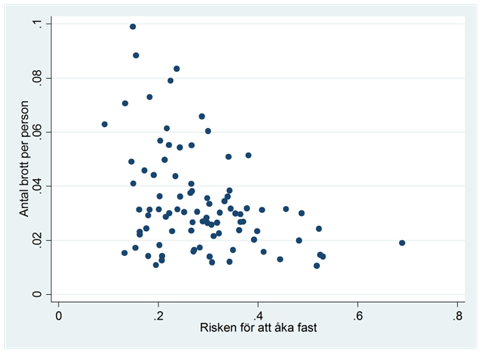 Figuren nedan illustrerar sambandet med hjälp av ett spridningsdiagram. På x-axeln visas risken för att åka fast; på y-axeln visas antalet brott per person. Varje “prick” i diagrammet representerar en observation, dvs. en ort. Exempelvis ser vi att det finns en ort där risken för att åka fast är ~0,7. På den orten begås det ~0,02 brott per person. I tabellen ovan är detta ort #89.