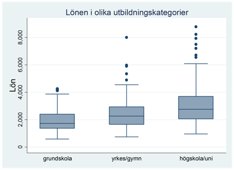 Exempel. Tjänar högutbildade mer än lågutbildade? Figuren nedan visar lönerna i tre utbildningsgrupper: personer med enbart grundskoleutbildning, personer med gymnasie- eller yrkesutbildning och sådana med högskole- eller universitetsutbildning.
