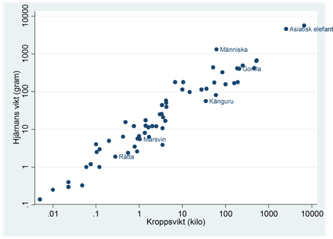 När vi använder den logarimiska skalan för både kroppsvikt och hjärnans vikt så tänker vi oss att en viss procentuell förändring i kroppsvikt hänger samman med en viss procentuell förändring i hjärnans vikt. Och som vi ser från spridningsdiagrammet ovan så är detta en bra beskrivning av sambandet. Grovt räknat så gäller att en ökning i kroppsvikten med en faktor på 10 hänger samman men en ökning i hjärnans vikt med en faktor på 10.