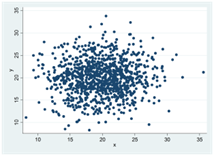 I spridningsdiagrammet nedan är korrelationen 0: Då x ökar så varken ökar eller minskar y i genomsnitt. Men den här beskrivningen av sambandet är rätt torftig, dvs. den säger mycket litet om hur sambandet de facto ser ut.
