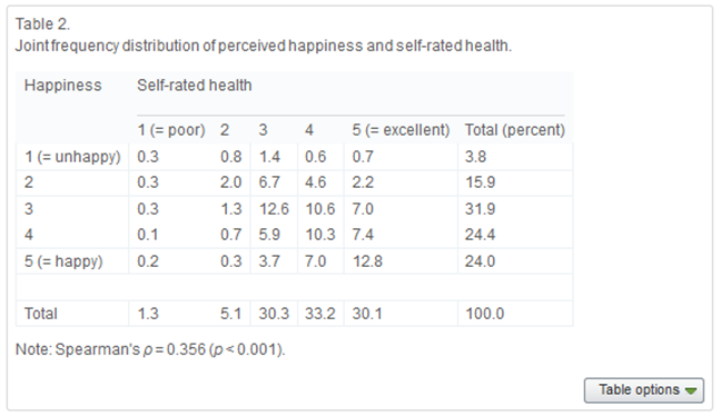 - Nedan ser du en tabell klippt ur artikeln Income inequality, perceived happiness, and self-rated health: Evidence from nationwide surveys in Japan. Här har författarna bland annat mätt sambandet mellan hälsa och lycka med Spearmans rangkorrelation. Data täcker tiotusentals japaner.