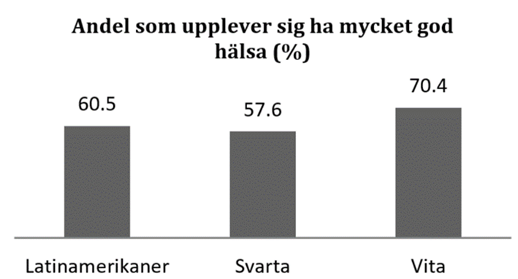 Exempel. Finns det ett samband mellan etnisk bakgrund och hälsa? I National Health Interview Survey intervjuas tusentals amerikaner angående sin hälsa. Figuren nedan visar visar att cirka 60 procent av latinamerikaner och svarta anser sig ha mycket god hälsa; bland vita är motsvarande siffra cirka 70 procent.