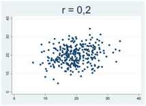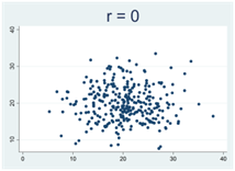 Spridningsdiagrammen nedan representerar en korrelation på noll: Då x ökar så varken ökar eller minskar y i genomsnitt.
