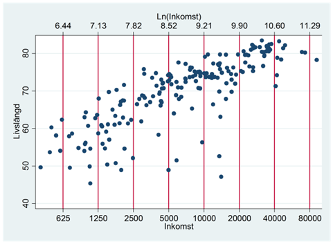 Man kan undra om det inte är fusk att ändra skalan på det här viset? Men nej, snarare är det tvärtom. När vi beräknar Pearsons korrelationskoefficient och använder den vanliga skalan så tänker vi oss att en viss ökning i inkomst hänger samman med en viss ökning i livslängd; med den logaritmiska skalan tänker vi oss istället att en viss procentuell ökning i inkomst hänger samman med en viss ökning i livslängd. Den logaritmiska skalan ger oss här en bättre representation av sambandet.