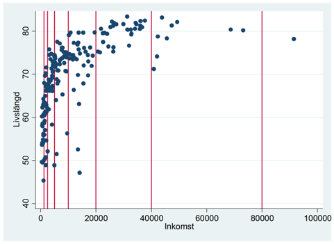 Korrelationen mellan ln(inkomst) och livslängd är 0,79.