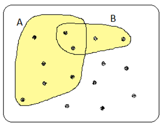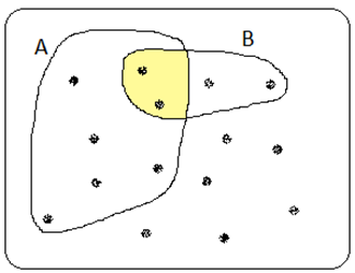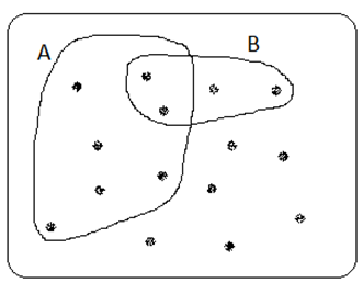 Nedan ser du ett venndiagram. Vi brukar använda dem som ett stöd när vi tänker kring sannolikheter. De illustrerar allt det som kan hända när vi utför ett slumpmässigt försök. Anta att vi har en kurs med 15 studerande. Vi väljer slumpmässigt ut en studerande från den här kursen (det är vårt slumpmässiga försök). Då finns det 15 möjliga utfall, representerat av prickar i figuren nedan. Vi kan gruppera dessa utfall på olika sätt (“studenten är en kvinna”, “studenten är vänsterhänt”, “studenten är ekonom”, osv.) Vi brukar kalla en sådan grupp av utfall för en händelse; de enskilda utfallen brukar ofta benämnas element. I figuren nedan har vi ritat ut två sådana händelser: “studenten är en kvinna” (området betecknat med A) och “studenten är vänsterhänt” (området betecknat med B). Klassen har alltså 7 kvinnor och 4 vänsterhänta, varav 2 är kvinnor.