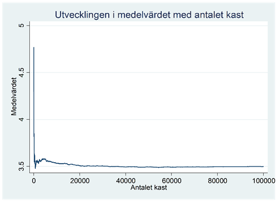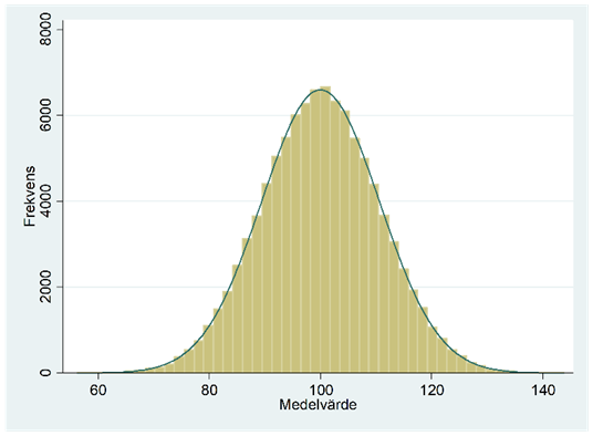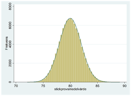 Figuren nedan beskriver fördelningen för dessa 100 000 stickprovsmedelvärden. Det här är med andra ord samplingfördelningen för stickprovsmedelvärdet. (Om vi ska vara helt korrekta så vore detta samplingfördelningen först när vi låter antalet sampel gå mot oändligheten.)