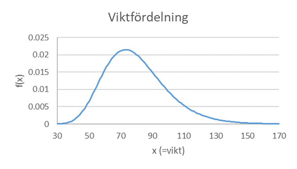 I en studie vill man uppskatta hur mycket finländare väger i genomsnitt. Anta att man slumpmässigt väljer ut 100 finländare från fördelningen ovan. Hur stor är sannolikheten för att få ett sampel där stickprovsmedelvärdet hamnar minst 3 kilo fel? Alltså ett medelvärde på 77 eller mindre, alternativt 83 eller mer?