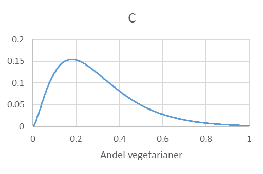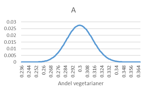 - Vi väljer slumpmässigt ut 1000 personer från en population där 30 procent är vegetarianer. Låt \(\widehat{p}\) beteckna andelen vegetarianer i samplet. Vilken av följande figurer (A, B eller C) representerar samplingfördelningen för \(\widehat{p}\)? Förklara kortfattat.